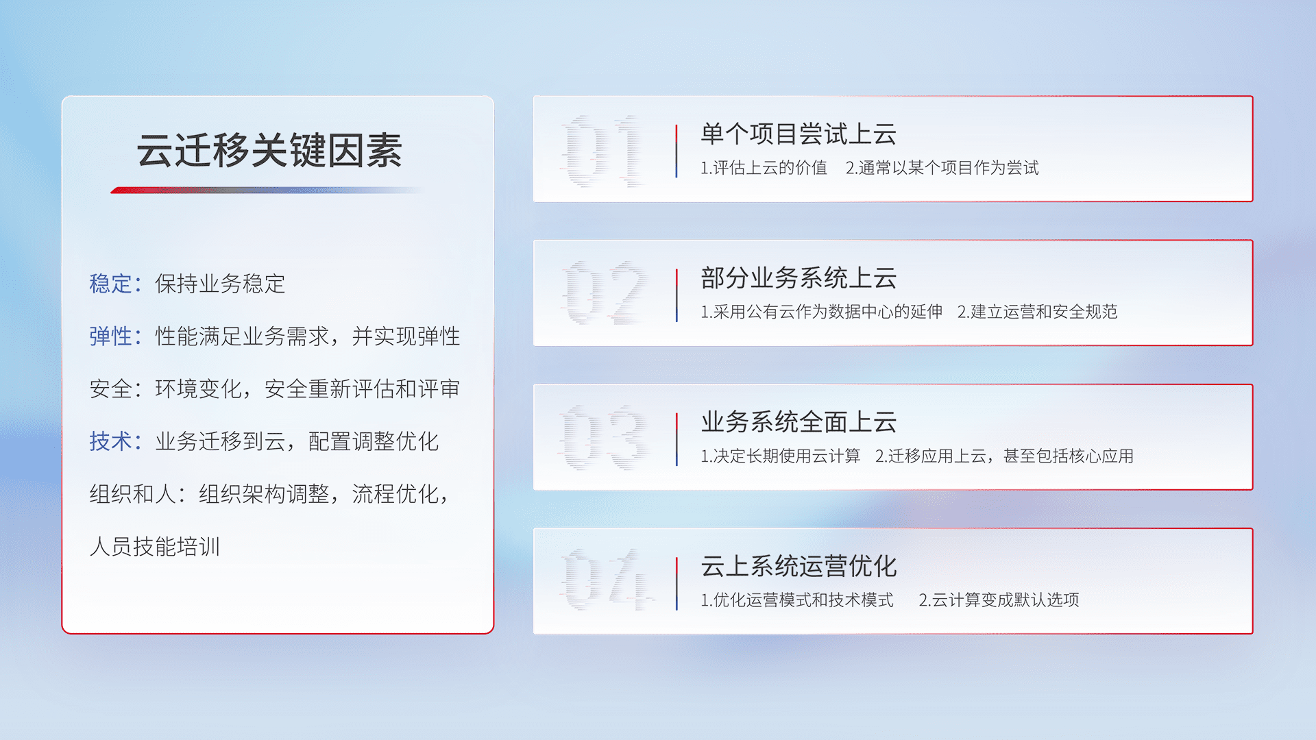 结合实际业务,,,,从规划设计、、云平台选型、、、、云原生改造、、、数据迁移、、、集成交付,,迁移全过程为客户识别最佳上云路径,,,,做好风险识别管理,,设计网络架构、、、身份权限、、、安全审计合规、、操作审计、、、、日志审计、、监控告警策略、、、多站点容灾设计等,,对云上基础设施进行整体规划,,,提升IT治理水平,,以满足弹性、、、、高可用、、高性能的需求。。